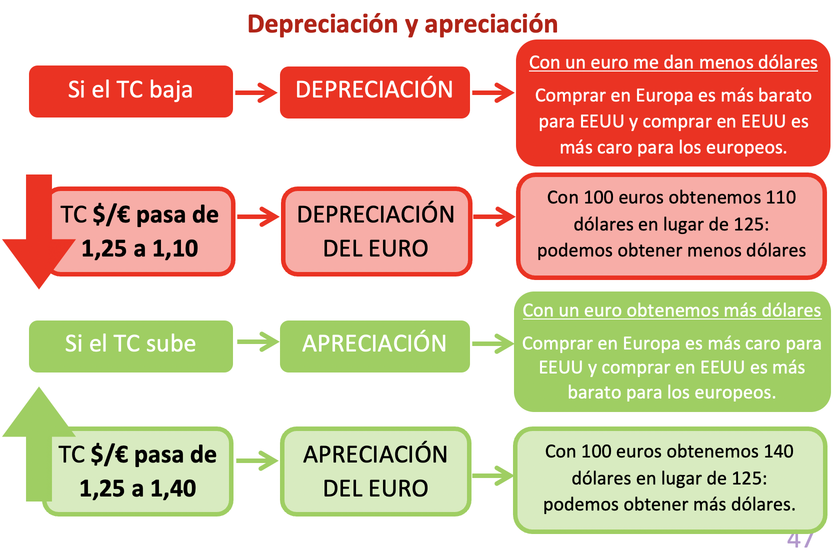 Cuando el tipo de cambio baja, significa que la moneda de un país se debilita en relación con otra moneda. Por ejemplo, si el tipo de cambio euro/dólar baja, significa que se necesitan menos dólares para comprar un euro. Esto se puede expresar como: "El euro se depreció frente al dólar" o "El dólar se apreció frente al euro".